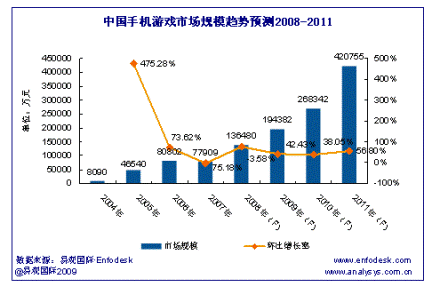 據(jù)易觀國際(Analysys International)最新報告《中國手機游戲市場趨勢預(yù)測2008-2011》研究結(jié)果顯示:2011年中國手機游戲(本文手機游戲范疇均為基于JAVA和BREW技術(shù)開發(fā)的手機游戲)市場規(guī)模將達到42億元,從2003年到2011年的手機游戲市場規(guī)模年均復(fù)合增長率為147.90%。其中移動運營商收入從2003年到2011年年均復(fù)合增長率將達143.26%,手機游戲SP收入從2003年到2011年年均復(fù)合增長率將達348.01%。手機游戲SP高復(fù)合增長率主要由自身對手機聯(lián)網(wǎng)游戲產(chǎn)品的推動、用戶對休閑娛樂應(yīng)用需求的增長、3G網(wǎng)絡(luò)商用等因素所帶動。