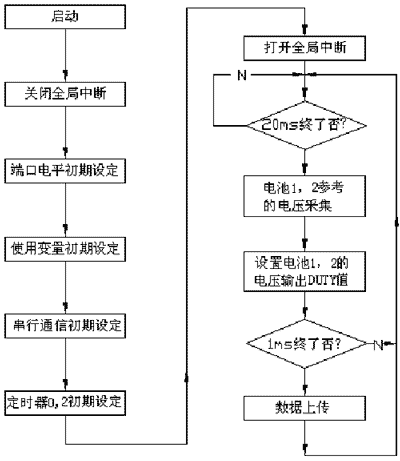 為了驗證本文的均衡充電方法,以兩節(jié)單體電池組成的蓄電池組為例進行實驗和分析,主要驗證旁路中開關(guān)管對電壓的調(diào)節(jié)作用??刂屏鞒桃妶D4。