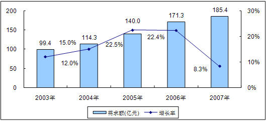 圖1 2004-2008年中國(guó)LED市場(chǎng)需求額