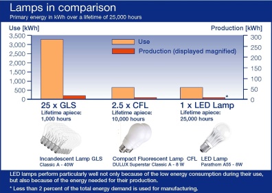 此次研究是與西門(mén)子研究院生態(tài)創(chuàng)新中心 (Siemens Corporate Technology, Centre for Eco Innovations) 的專(zhuān)家合作進(jìn)行的。研究結(jié)果表明,LED 燈與緊湊型熒光燈相似,也是將超過(guò) 98% 的能耗用于發(fā)光,只有不到 2% 的能耗用于生產(chǎn),這就打消了人們認(rèn)為生產(chǎn)LED 可能特別耗費(fèi)能源的擔(dān)憂(yōu)。白熾燈的一次能源消耗為 3,300 kWh 左右,而 LED 燈的一次能源消耗不到 700 kWh,因此,LED 燈顯然比傳統(tǒng)白熾燈更高效。除此之外,該評(píng)估結(jié)果還表明,LED 燈在整個(gè)生命周期中對(duì)環(huán)境的影響始終優(yōu)于白熾燈。