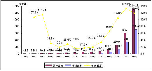 圖1 1995-2008年中國風電裝機容量及其增長情況