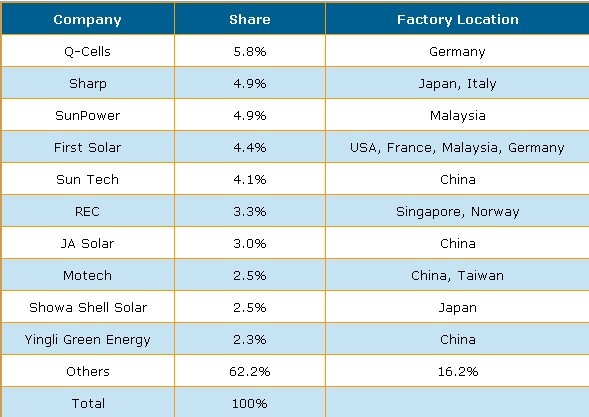 六 :依照2009年全球太陽能電池(Cell)的產(chǎn)能來看,F(xiàn)irst Solar 是最大廠商,其產(chǎn)能達到10億瓦(1 GW),Q-Cells 與 Suntech 并列第二。在接下來的數(shù)年之內,主要的設備投資亦由這些領導廠商所帶動。DisplaySearch預測到2013年,F(xiàn)irst Solar, Q-Cells, Suntech 等前三大廠商以及JA Solar, Motech, REC, SunPower, Yingli, Showa Shell Solar, and Sharp 等等會是全球前十大供貨商,合計產(chǎn)能將達16GW (160億瓦),將占2013年全球產(chǎn)能的38%。