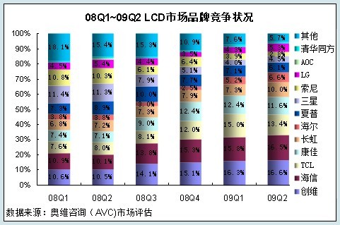 T6陣營(yíng)(TCL、創(chuàng)維、海爾、海信、長(zhǎng)虹、康佳)在2008年,借助“奧運(yùn)攻勢(shì)”等活動(dòng)發(fā)力,并通過(guò)產(chǎn)品線的不斷更新定義,終端渠道的投入及價(jià)格戰(zhàn)等逐步確立主導(dǎo)地位。但由于受面板價(jià)格上升及缺貨的影響,2009年二季度國(guó)內(nèi)品牌市場(chǎng)地位容易下滑,S3(三星、索尼、夏普)挾技術(shù)及面板資源攻守兼?zhèn)?,同時(shí)LG、冠捷、清華同方品牌也正發(fā)力提升LCD電視市場(chǎng)銷售,市場(chǎng)競(jìng)爭(zhēng)愈加激烈。
