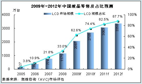 受上半年經(jīng)濟(jì)形勢(shì)低迷以及產(chǎn)品替代影響,即使在家電下鄉(xiāng)、節(jié)能補(bǔ)貼、以舊換新三大政策刺激下,2009年全年彩電市場(chǎng)零售量規(guī)模將較2008年下降6.5%。但對(duì)于液晶電視來(lái)說(shuō),則得益于三大政策的刺激,繼續(xù)保持高速增長(zhǎng),預(yù)計(jì)全年LCD電視市場(chǎng)國(guó)內(nèi)零售量規(guī)模近2100萬(wàn)臺(tái),出貨規(guī)模可達(dá)2400萬(wàn)臺(tái),LCD電視市場(chǎng)將占總體市場(chǎng)比達(dá)到62.6%。