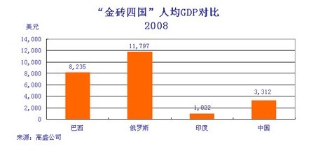 圖4:2008年金磚四國人均GDP對比。數(shù)據(jù)來源:高盛
