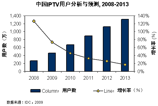 在未來(lái)幾年中,可以預(yù)見(jiàn),無(wú)論是出于集團(tuán)利益還是內(nèi)容監(jiān)管的需要,對(duì)IPTV的監(jiān)管不會(huì)有本質(zhì)的顯著改變,中國(guó)IPTV仍將在一段時(shí)期內(nèi)處于非完全市場(chǎng)化的發(fā)展和競(jìng)爭(zhēng)狀態(tài),但是隨著產(chǎn)業(yè)環(huán)境的完善和消費(fèi)者認(rèn)知和接受程度的提高,IPTV的用戶(hù)規(guī)模必將穩(wěn)步擴(kuò)張。IDC預(yù)計(jì),2009年中國(guó)IPTV用戶(hù)將達(dá)到460萬(wàn),同比增長(zhǎng)73.6%,2013年將達(dá)到1310萬(wàn)用戶(hù)的規(guī)模。在這個(gè)過(guò)程中,已經(jīng)將IPTV定位為未來(lái)戰(zhàn)略轉(zhuǎn)型業(yè)務(wù)的電信運(yùn)營(yíng)商和尋求新媒體發(fā)展機(jī)遇的內(nèi)容運(yùn)營(yíng)商,將需要通過(guò)更加專(zhuān)業(yè)細(xì)分的內(nèi)容整合、更加關(guān)注用戶(hù)體驗(yàn)的營(yíng)銷(xiāo)策略,來(lái)驅(qū)動(dòng)市場(chǎng)的進(jìn)一步發(fā)展。