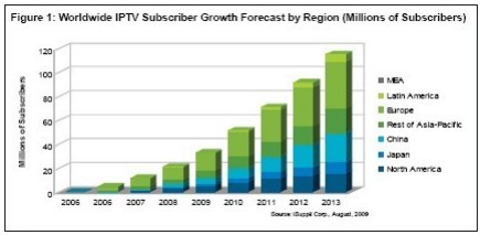 2009 年第一季度結(jié)束的時候,全球 IPTV用戶數(shù)量是 2140 萬,49%位于歐洲,接近一半。包括北美和亞太在內(nèi)的其它地區(qū),IPTV 用戶數(shù)量相對較少,但增長潛力巨大,因為這些地區(qū)——包括歐洲在內(nèi),IPTV 在電信寬帶用戶中的市場占有率還不到 15%。這意味著電信運營商在未來五年及更長遠的將來,有充分的機會擴大自己的業(yè)務(wù)。