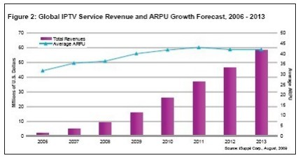 好消息是,在目前經(jīng)濟沉陷衰退之際,IPTV的好處已經(jīng)顯現(xiàn)出來。2008 年第四季度和2009 年第一季度,IPTV經(jīng)受住了經(jīng)濟衰退的沖擊,2009年有望增長 56%,用戶數(shù)量增到 3330萬個。2008年全球用戶數(shù)量是 2130萬。