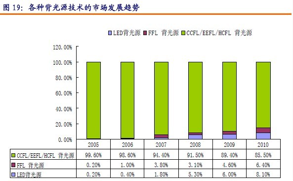 可以看出,從2006年到2008LED背光源的快速成長期。如果按照2010年TFT-LCD市場銷售額950億美元,背光模組占其中20%計(jì)算,屆時(shí)背光模組的份額約為190億美元。據(jù)此推算,LED背光模組份額為15.39億美元,這是比較保守的估計(jì)。