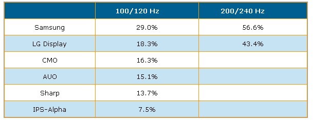 根據(jù)DisplaySearch調(diào)查指出,第二季全球采用倍頻及雙倍頻掃描技術(shù)液晶電視面板出貨達(dá)到640萬(wàn)片,出貨量市占率達(dá)18.3%,較上一季提高2%。以廠商別來(lái)看,Samsung以29%市占率居100/120Hz出貨量排名冠軍,LG Display以18.3%是占率居次,CMO(奇美)、AUO(友達(dá))、Sharp與IPS-Alpha分居第三到六名。在雙倍頻面板出貨量方面,主要為韓國(guó)二家面板廠商所主導(dǎo),市占率如表二所示。