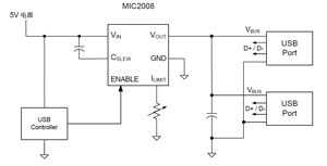 圖7是一種輸出限制電流可調(diào)節(jié)的USB端口電路。該電路由MIC2008作功率分配開(kāi)關(guān),由USB控制器對(duì)功率分配開(kāi)關(guān)實(shí)現(xiàn)控制。限定的電流由外設(shè)電阻R來(lái)設(shè)定(限制電流范圍為0.2~2.0A)。該功率分配開(kāi)關(guān)的輸出電壓上升率(啟動(dòng)時(shí)間)可由外設(shè)電容C來(lái)設(shè)定,內(nèi)部有過(guò)熱保護(hù)及輸入電壓過(guò)低時(shí)輸出鎖存保護(hù)。