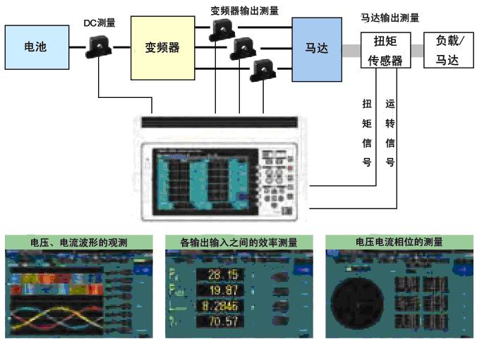 在強(qiáng)化新能源相關(guān)系統(tǒng)的開發(fā)和設(shè)備的節(jié)能化的進(jìn)程中,針對功率測量方面的要求涉及許多方面。圖1是變頻器馬達(dá)測量的典型例子,而且最近的動向和測量需求的主要方面,可列舉出以下事項: