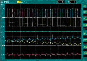 此外,3390還具備以X-Y圖表顯示來確認(rèn)變頻器的動態(tài)特性的功能,變頻器不可或缺的諧波測量功能,用FFT評估影響變頻器的干擾的功能(可達(dá)100kHz)等(圖2)。而且,利用3390的500k采樣/秒的高速采樣率,來顯示電壓/電流波形(圖3)。之前,需要使用數(shù)字示波器和差分探頭、鉗式電流傳感器來觀測波形,非常麻煩,現(xiàn)在1臺3390即可實現(xiàn)。