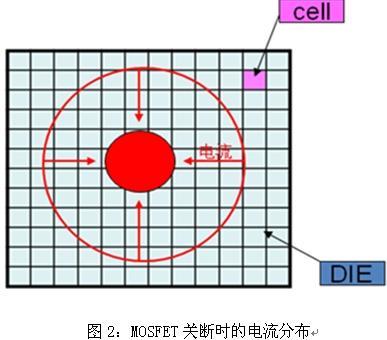 如果MOSFET所加的負載為感性負載,由于電感電流不能突變,導致流過MOSFET的電流向晶元的中間流動,如圖2所示。這樣就會造成MOSFET局部單元過熱而導致MOSFET局部單元損壞。如果加快MOSFET的關斷速度,以盡量讓MOSFET快速關斷,不讓能量產生集聚點,這樣就不會因局部單元過熱而損壞MOSFET。注意到:MOSFET的關斷過程是一個由穩(wěn)態(tài)向非穩(wěn)態(tài)過渡的過程,與此相反,MOSFET在開通時,由于負載的電流是隨著單元的逐漸開通而不斷增加的,因此是一個向穩(wěn)態(tài)過渡的過程,不會出現(xiàn)關斷時產生的能量集聚點。