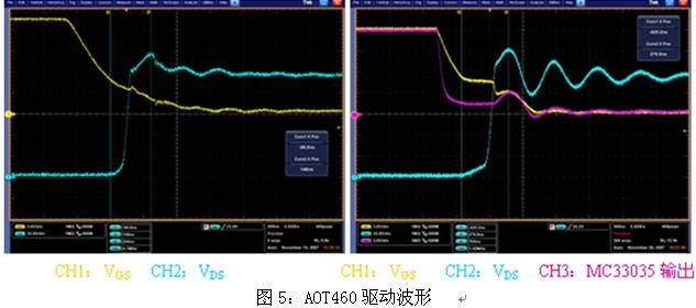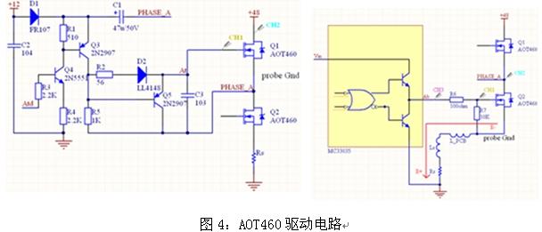 圖4是電動車控制器的兩種驅動MOSFET管AOT460驅動電路,分立器件驅動時,PWM在上橋臂,直接用MC33035驅動時,PWM在下橋臂。