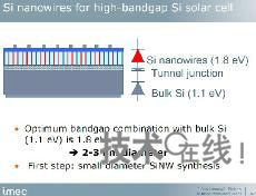 - IMEC的目標(biāo)是實(shí)現(xiàn)在硅底板上形成硅納米線的太陽(yáng)能電池,轉(zhuǎn)換效率將達(dá)到約33%