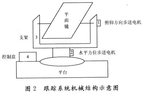 本文介紹的是一種基于單片機(jī)控制的雙軸太陽自動(dòng)跟蹤系統(tǒng),系統(tǒng)主要由平面鏡反光裝置、調(diào)整執(zhí)行機(jī)構(gòu)、控制電路、方位限位電路等部分組成。跟蹤系統(tǒng)電路控制結(jié)構(gòu)框圖如圖1所示,系統(tǒng)機(jī)械結(jié)構(gòu)示意圖如圖2所示。