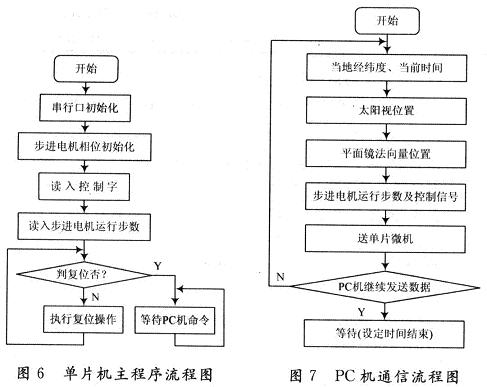 任意時(shí)刻太陽的位置可以用太陽視位置精確表示。太陽視位置用太陽高度角和太陽方位角兩個(gè)角度作為坐標(biāo)表示。太陽高度角指從太陽中心直射到當(dāng)?shù)氐墓饩€與當(dāng)?shù)厮矫娴膴A角。太陽方位角即太陽所在的方位,指太陽光線在地平面上的投影與當(dāng)?shù)刈游缇€的夾角,可近似地看作是豎立在地面上的直線在陽光下的陰影與正南方的夾角。系統(tǒng)采用水平方位步進(jìn)電機(jī)和俯仰方向步進(jìn)電機(jī)來追蹤太陽的方位角和高度角,從而可以實(shí)時(shí)精確追蹤太陽的位置。上位機(jī)負(fù)責(zé)任意時(shí)刻太陽高度角和方位角的計(jì)算,并運(yùn)用軟件計(jì)算出當(dāng)前狀況下俯仰與水平方向的步進(jìn)電動(dòng)機(jī)運(yùn)行的步數(shù),將數(shù)據(jù)送給跟蹤系統(tǒng)驅(qū)動(dòng)器,單片機(jī)接收上位機(jī)送來的數(shù)據(jù),驅(qū)動(dòng)步進(jìn)電機(jī)的運(yùn)行。系統(tǒng)具有實(shí)現(xiàn)復(fù)位、水平方位的調(diào)整,俯仰方向的調(diào)整,太陽的跟蹤及手動(dòng)校準(zhǔn)等功能。[page]