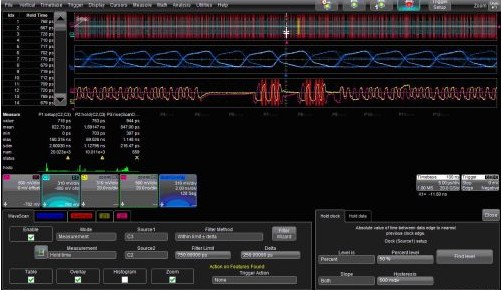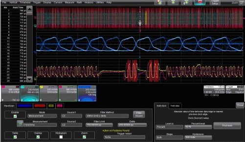 力科的WaveScan波形搜索與掃描特性可以通過選擇Strobe和掃描疊加(ScanOverlay)圖中滿足條件的波形之間的時序關系找出Data信號。圖2是這種功能的一個例子。WaveScan的對話框設置為搜索建立時間(Hold Time)在500ps到1ns(750 ±250 ps)之間的波形。對話框右邊的標簽用來鑒別Strobe和Data信號。注意“Hold Clock”和“Hold Data”兩個對話框標簽,測量是對這兩個信號邊沿設定的。