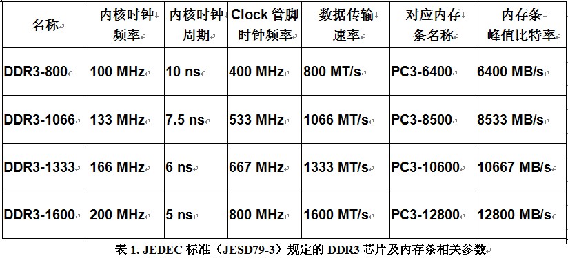 下表列出了JEDEC標(biāo)準(zhǔn)(JESD79-3)規(guī)定的DDR3芯片及內(nèi)存條相關(guān)參數(shù)。需要說明的是,如前所述,并不是所有的內(nèi)存產(chǎn)品都完全遵從JEDEC標(biāo)準(zhǔn),有些廠商會(huì)生產(chǎn)速度更高速的DDR3芯片,一般情況下這些芯片是從芯片檢測(cè)流程中篩選出來的頻率動(dòng)態(tài)范圍更大的芯片,或者是可加壓超頻工作的芯片。