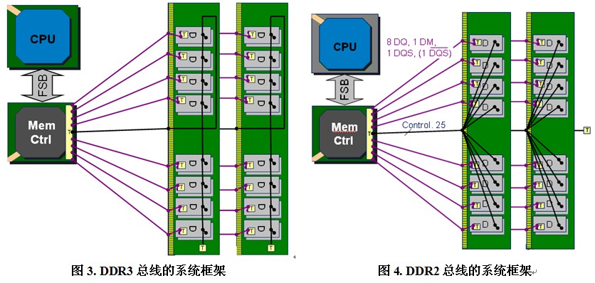 在系統(tǒng)設(shè)計(jì)方面DDR3與DDR2最大的區(qū)別在于DDR3將時(shí)鐘、地址及控制信號(hào)線的終端電阻從計(jì)算機(jī)主板移至內(nèi)存條上,這樣一來在主板上將不需要任何端接電阻。為了盡可能減小信號(hào)反射,在內(nèi)存條上包括時(shí)鐘線在內(nèi)的所有控制線均采用Fly-by拓?fù)浣Y(jié)構(gòu)。同時(shí),也是因?yàn)镕ly-by的走線結(jié)構(gòu)致使控制信號(hào)線到達(dá)每顆內(nèi)存顆粒的長(zhǎng)度不同從而導(dǎo)致信號(hào)到達(dá)時(shí)間不一致。這種情況將會(huì)影響內(nèi)存的讀寫過程,例如在讀操作時(shí),由于從內(nèi)存控制器發(fā)出的讀命令傳送到每顆內(nèi)存芯片的時(shí)間點(diǎn)不同,將導(dǎo)致每顆內(nèi)存芯片在不同的時(shí)間向控制器發(fā)送數(shù)據(jù)。為了消除這種影響,需要在對(duì)內(nèi)存進(jìn)行讀寫等操作時(shí)對(duì)時(shí)間做補(bǔ)償,這部分工作將由內(nèi)存控制器完成。DDR3總線的系統(tǒng)框架如下圖所示,其中紅線代表DQ、DM以及差分DQS信號(hào)線,黑線代表時(shí)鐘、地址及控制信號(hào)線,T代表相應(yīng)的端接電阻。