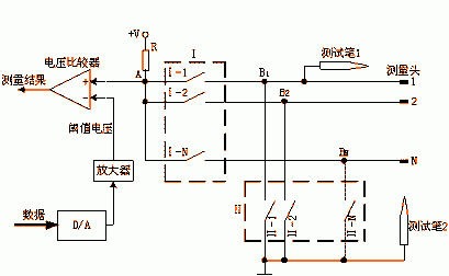 實(shí)現(xiàn)自動測量的前提是將被測元件引腳連入探測電路中,為此探測設(shè)備設(shè)置若干個(gè)測量頭,通過電纜引出,測量頭可掛接各種測試夾具與元件引腳建立連接,測量頭的數(shù)量決定了同一批連入探測電路的引腳數(shù)。然后在程序控制下探測儀按組合原則依次將被測"引腳對"一一納入測量通路。在測量通路中將"引腳對"之間的通/斷路狀況呈現(xiàn)為引腳間有無電阻,測量通路將其轉(zhuǎn)換為一個(gè)電壓量,由此判斷它們之間的通/斷路關(guān)系并加以記錄。