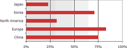 DisplaySearch研究指出,不同地區(qū)市場(chǎng)的電視性能有顯著的差異。例如在待機(jī)能耗的部份,日本電視要求在0.3瓦特以下,歐洲電視則在0.5瓦特以下,然而在北美,即便是經(jīng)過(guò)能源之星(Energy Star)認(rèn)證的電視,待機(jī)時(shí)消耗功率仍維持在0.5到0.6瓦特之間。Paul Gray補(bǔ)充說(shuō):“實(shí)際上我們發(fā)現(xiàn)在北美仍有許多電視待機(jī)時(shí)消耗功率超過(guò)1瓦特。如果其它地區(qū)能如加州一樣倡導(dǎo)電力節(jié)省,將可以同時(shí)節(jié)省消費(fèi)者的荷包。”