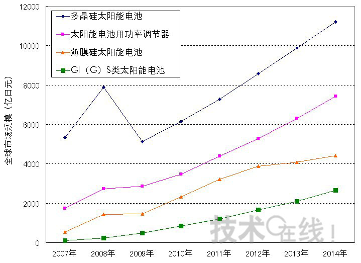 - 多晶硅太陽(yáng)能電池的市場(chǎng)規(guī)模在2008年快速增長(zhǎng)至7888億日元