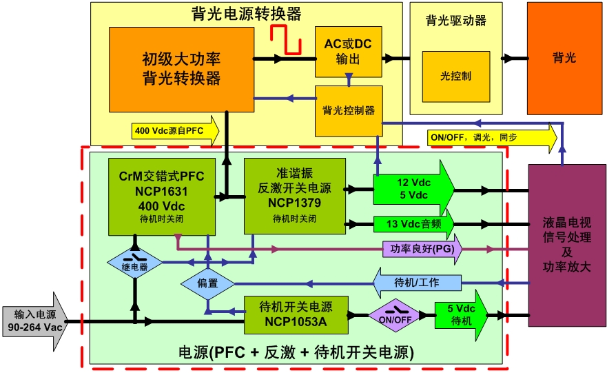 例如,目前市場上銷量最大的是32英寸液晶電視。在這類液晶電視中,采用標(biāo)準(zhǔn)24 V逆變器電源的方案在市場上仍占據(jù)多數(shù),但新興的高壓液晶電視集成電源(HV-LIPS)的應(yīng)用也在不斷增多,總體上呈現(xiàn)出并存的態(tài)勢。采用標(biāo)準(zhǔn)24 V逆變器的傳統(tǒng)液晶電視在接受110/220 Vac市電輸入后,經(jīng)過整流、PFC及濾波,轉(zhuǎn)換為200/400 Vdc的直流高壓。由于傳統(tǒng)高壓逆變器的輸入電壓要求是24 Vdc,故PFC的輸出電壓200/400 Vdc會(huì)經(jīng)過降壓轉(zhuǎn)換,產(chǎn)生多路輸出電壓,其中一路24 Vdc電壓提供給高壓逆變器,再經(jīng)過DC-AC轉(zhuǎn)換為超過1,000 V甚至達(dá)2,000 V的交流高壓,去驅(qū)動(dòng)液晶面板的CCFL陣列。安森美半導(dǎo)體為這類傳統(tǒng)液晶電視推出了220 W液晶電視電源GreenPoint參考設(shè)計(jì),其中采用的關(guān)鍵元器件包括NCP1606 CrM PFC控制器、NCP1396諧振半橋控制器及NCP1027待機(jī)控制器等。