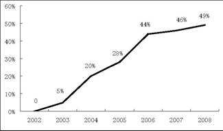 自2003年啟動半導體照明工程和“十一五”863重大項目實施以來,我國LED外延材料、芯片制造、器件封裝、熒光粉等方面均已顯現(xiàn)具有自主技術(shù)產(chǎn)權(quán)的單元技術(shù),部分核心技術(shù)具有原創(chuàng)性,初步形成了從上游材料、中游芯片制備、下游器件封裝及集成應用的比較完整的研發(fā)與產(chǎn)業(yè)體系,為我國LED產(chǎn)業(yè)做大做強在一定程度上奠定了基礎。目前我國芯片企業(yè)產(chǎn)業(yè)化線上完成的功率型芯片封裝后光效超過90lm/W。具有自主知識產(chǎn)權(quán)的功率型硅襯底led芯片封裝后光效達到78lm/W,處于國際先進水平。根據(jù)國家半導體照明工程研發(fā)及產(chǎn)業(yè)聯(lián)盟統(tǒng)計,從2004年開始國內(nèi)LED產(chǎn)業(yè)累計新增投資規(guī)模達150億元,最近連續(xù)3年,每年企業(yè)訂購并安裝投入的MOCVD數(shù)量超過50臺以上,國產(chǎn)化率大幅提高,截止2008年底,芯片國產(chǎn)化率達到49%(見圖1)。按照目前聯(lián)盟成員單位的擴產(chǎn)計劃和機臺訂單數(shù)量,預計未來3年國內(nèi)將增加MOCVD近兩百臺。目前Cree、旭明以及臺灣芯片廠商都以合資的形式進入了國內(nèi),勢必進一步帶動芯片的國產(chǎn)化。2015年芯片國產(chǎn)化率有可能達到70%。