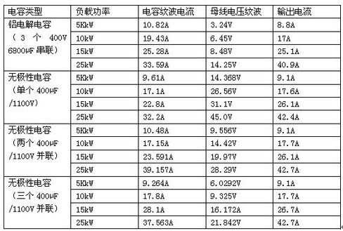 第三個替換試驗是用薄膜電容器替代660V交流輸入電壓變頻器中的鋁電解電容器。由于手頭沒有660V感應(yīng)電機,負載只能采用電阻箱替代感應(yīng)電機。其測試結(jié)果列于表3。