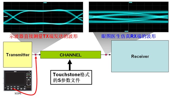 眼圖醫(yī)生(Eye Doctor)是力科于2006年推出的用于高速串行數(shù)字電路設(shè)計(jì)的強(qiáng)大工具,集成在高帶寬示波器中,包括了虛擬探測(virtual probing)與接收端均衡(receiver equalization)兩部分,主要用于通訊背板設(shè)計(jì)、高速串行信號(hào)一致性測試、高速SERDES芯片均衡器的優(yōu)化與設(shè)計(jì)等等。在2009年2月,力科發(fā)布了新一代的眼圖醫(yī)生II,提供了更強(qiáng)大的分析能力與良好人機(jī)界面。如下圖1所示,利用Eye Doctor的信道仿真功能,可以用示波器測量到的TX端發(fā)送的波形,在Eye Doctor II中導(dǎo)入信道的S參數(shù)模型文件,計(jì)算出通過信道后RX端的信號(hào)波形、眼圖與抖動(dòng),其功能類似于EDA的SI仿真工具。