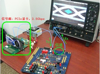 對(duì)比分析的工作環(huán)境如圖2所示:信號(hào)源為某PCIe顯卡發(fā)送的2.5Gbps的信號(hào),信道為某DEMO板上24英寸長的傳輸線,接收端為兩個(gè)50歐的電阻。分別在三種情況下進(jìn)行分析: