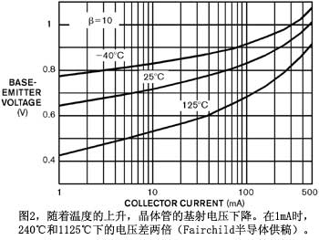 熱與冷都會(huì)對電路造成負(fù)面影響。在極高溫下,芯片可能燒毀(圖1)。更常見的情況是,如果你的設(shè)計(jì)達(dá)到未曾預(yù)料的溫度,很多部件都可能超出規(guī)定極限。當(dāng)出現(xiàn)這種情況時(shí),電路就可能表現(xiàn)出難以預(yù)料的行為。另外一個(gè)情況也同樣值得關(guān)注,即電路溫度從熱到冷,然后又從冷到熱。這種狀況會(huì)造成熱沖擊,也會(huì)毀壞元件。很多工程師并不關(guān)心自己的電路在低溫下的性能,但這種忽視是一個(gè)錯(cuò)誤。半導(dǎo)體器件的性能在低溫下會(huì)發(fā)生顯著變化。雙極晶體管的基射結(jié)電壓在低溫下會(huì)大大升高(圖2和參考文獻(xiàn)1)。AnalogDevices產(chǎn)品開發(fā)工程經(jīng)理FranciscoSantos說:“如果你要設(shè)計(jì)一個(gè)能夠在負(fù)溫度下工作于1.8V的放大器,就要考慮當(dāng)從室溫降到-40℃時(shí),VBE(基射電壓)會(huì)增加130mV。這種情況將迫使設(shè)計(jì)者采用一組完全不同的放大器架構(gòu)。”