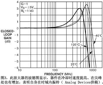 很多放大器,如AnalogDevices的AD8045,在冷卻時(shí)會(huì)加速(圖3),而有些放大器(如AD8099)則在變冷時(shí)會(huì)降速。已退休的LinearTechnology信號處理產(chǎn)品前副總裁兼總經(jīng)理BillGross稱:“雙極晶體管在低溫下遇到的多數(shù)麻煩是低電壓工作。”他認(rèn)為,較高的基射電壓和較小的電流增益都更難于滿足規(guī)格要求。他說:“較低的輸入阻抗和b(電流增益)的不匹配都會(huì)造成低溫下的大問題。尤其是當(dāng)它們?yōu)槭覝剡\(yùn)行作了調(diào)整時(shí)。較高的gm(跨導(dǎo))很容易通過改變工作電流而得到補(bǔ)償,但這樣的話轉(zhuǎn)換速率就會(huì)變化。”