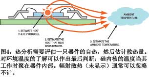 電路的熱分析分三個(gè)步驟。首先估計(jì)IC中產(chǎn)生的熱量。然后,估計(jì)電路板或散熱片散掉的熱量。最后,估計(jì)部件將要運(yùn)行的環(huán)境溫度(圖4)。在估計(jì)元件產(chǎn)生的熱量時(shí),DC分析通常沒什么價(jià)值。一只電壓為1V、流過1A電流的電阻器,會(huì)產(chǎn)生1W的熱量。但是,要估計(jì)交流或未確定的信號所產(chǎn)生的熱量就比較麻煩。首先,從電源端到接地腳的靜態(tài)電流總是在耗散一個(gè)直流功率。一個(gè)采用10V電源和5mA靜態(tài)