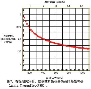 對流散熱也有一些困難。例如,氣流對商用散熱片的影響(圖7)。注意,在高溫下,熱阻會(huì)增加五倍。使用強(qiáng)制風(fēng)冷的散熱片有較薄、間距更近的鰭片,比如一款風(fēng)扇式CPU冷卻器。如果你的產(chǎn)品沒有風(fēng)扇,則IC產(chǎn)生的熱量會(huì)傳導(dǎo)和散播出來,然后傳送到機(jī)內(nèi)的空氣中。接下來,隨著整個(gè)機(jī)器溫度的上升,熱量通過對流傳送給周圍的空氣,如果你把機(jī)器放在腿上,則部分熱量也會(huì)傳導(dǎo)過來。外殼材料的熱阻就變得很重要。熱量從內(nèi)向外的傳送速度,塑料殼要慢于金屬殼。