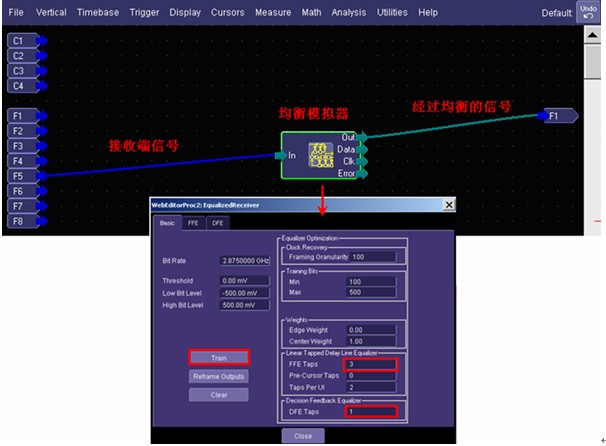 把經(jīng)過背板的已衰減信號加到示波器的均衡模擬器上,查看經(jīng)過均衡的信號眼圖。根據(jù)接收芯片實(shí)際情況,我們把FFE和DFE的抽頭數(shù)分別設(shè)為3和1,點(diǎn)擊Train,對均衡器進(jìn)行訓(xùn)練(圖12),就得到了均衡后的信號,其眼圖如圖13所示。
