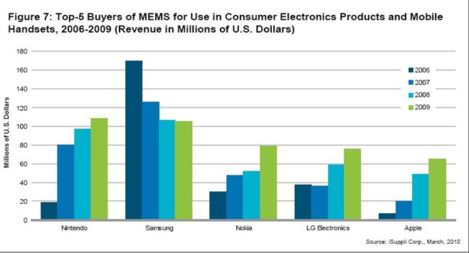 據(jù)iSuppli公司,日本任天堂在2009年超越韓國(guó)的三星,成為用于消費(fèi)電子產(chǎn)品和手機(jī)的微機(jī)電系統(tǒng)(MEMS)的全球最大買家。