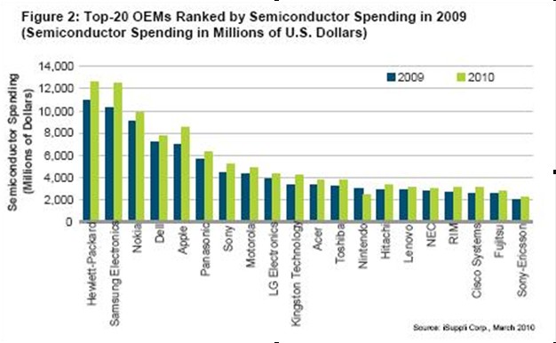 半導(dǎo)體OEM廠商的支出將增長(zhǎng)到1779億美元,比2009年的1570億美元增長(zhǎng)13%。在這些支出中,以惠普、三星、諾基亞和蘋(píng)果等巨頭為首的20大廠商,將占1037億美元或58%。這里所說(shuō)的OEM支出增長(zhǎng),假定包括最終產(chǎn)品所包含的全部芯片,不管是通過(guò)什么渠道購(gòu)買(mǎi)的——包括OEM直接采購(gòu),以及通過(guò)EMS或分銷(xiāo)商購(gòu)買(mǎi)的芯片。