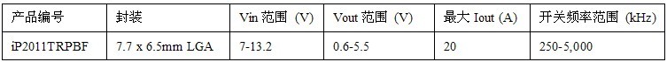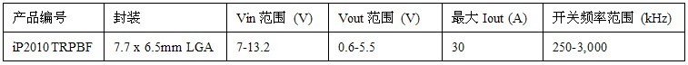 iP2010的輸入電壓范圍為7V至13.2V,輸出電壓范圍則為0.6V至5.5V,輸出電流高達(dá)30A。這個(gè)器件最高運(yùn)行頻率為3MHz。在5MHz運(yùn)行時(shí),與iP2010引腳兼容的iP2011備有相同的輸入和輸出電壓范圍,但后者經(jīng)過(guò)優(yōu)化,從而使最高輸出電流高達(dá)20A。通過(guò)以通用占位面積提供多種電流額定值器件,IR提供的靈活性能夠滿足不同客戶對(duì)電流水平、性能和成本的要求。