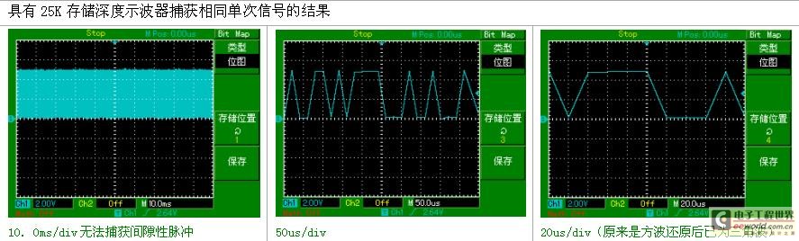 提高示波器的存儲深度可以間接提高示波器的采樣率。以一臺采樣率為1Gsa/s、存儲深度為20K的示波器為例來說,只要水平掃描速度在20ns/div以上時基,采樣速度就會急速下降。因為當(dāng)需要測量較長時間的信號波形時,必然要求大的時基檔位,這就造成采樣率的下降,采樣率的下降可能會遺漏信號的細(xì)節(jié)勢必造成信號波形質(zhì)量的下降。這時候就需要大的存儲深度來維持更高的采樣率來采樣測量。長存儲在保證獲取不失真的波形的同時又可以觀察更長時間的信號。
