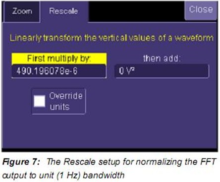 在重標(biāo)刻度后,F(xiàn)2中的FFT的垂直單位是 V2√Hz。通過對FFT跡線以下的區(qū)域積分可以確認(rèn)重標(biāo)刻度的正確性。Figure 5中用門限到用來限制噪聲源帶寬的濾波器的噪聲帶寬的區(qū)域參數(shù)來實現(xiàn),該處是280kHz。F2以下的區(qū)域是平均平方值, 32.575 E-6 V2。可以和C2中波形的平均平方值(變量)計算所得的參數(shù)P3 32.575 E-6 V2比較。