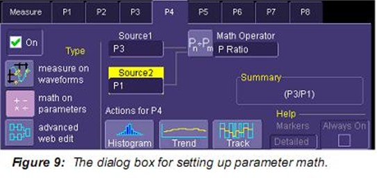 另一個關(guān)注的噪聲參數(shù)是峰值系數(shù),峰值對有效值的比率。這個決定動態(tài)范圍的參數(shù)需要處理信號中的峰值變化。示波器沒有雙“峰”參數(shù),但可以通過采用通道 C2的絕對值從而創(chuàng)建一個。將負(fù)值“翻轉(zhuǎn)”到波形的正上方以便用戶使用參數(shù)最大值讀取每個采集最大的正或負(fù)峰值。注意該處理因為信號具有0平均。使用參數(shù)數(shù)學(xué)計算峰值系數(shù)。參數(shù)數(shù)學(xué)設(shè)置如Figure 9所示,計算P3對P1的峰值系數(shù)P4。Figure 8中所示峰值系數(shù)平均值為4.3。