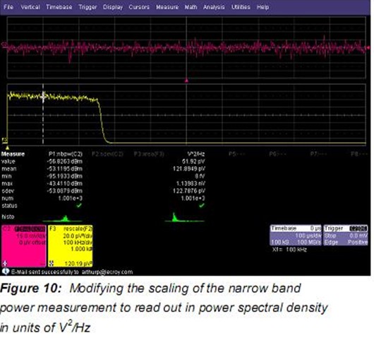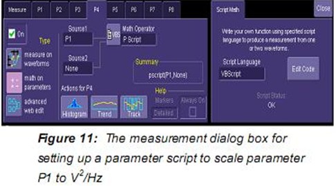 另一個進(jìn)行噪聲“點”測量的方法是采用可選的窄帶功率測量。窄帶功率(nbpw)通過計算給定頻率上的離散傅里葉變換測量功率。Nbpw的單位是dBm。噪聲測量不太方便,我們希望用噪聲功率譜密度線性單位V2√Hz來進(jìn)行測量。幸運(yùn)的是,力科示波器可以用腳本使用參數(shù)數(shù)學(xué)修改測量。這允許更復(fù)雜的計算而不是Figure 9所示的參數(shù)的簡單比率峰值系數(shù)。