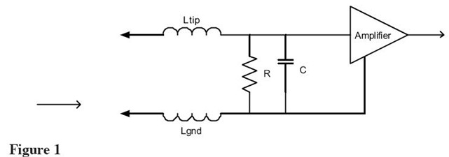 單端探頭有兩個輸入端——信號(尖端)和地。等效電路包括電感、DC電阻并聯的輸入電容和地夾的電感。地夾電感可以和尖端電感歸結在一起以簡化電路。有源探頭的等效電路如Figure1所示。給出的電感有兩個——尖端和地夾電感。地夾電感通常占主導地位并依據用戶連接待測系統(tǒng)地的方式而改變。