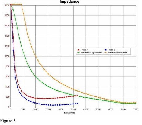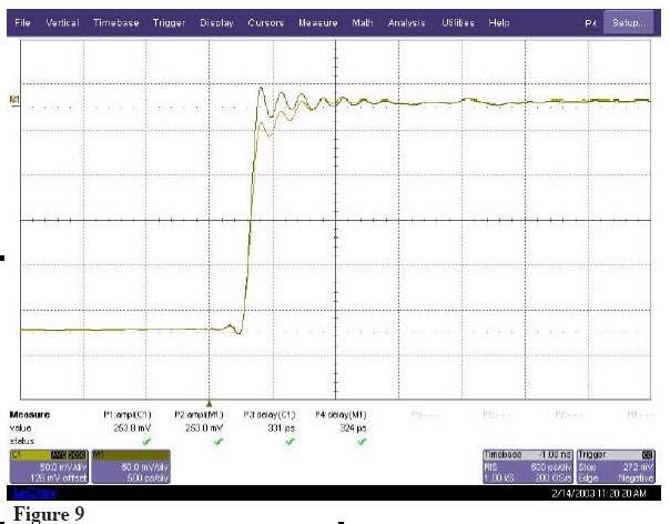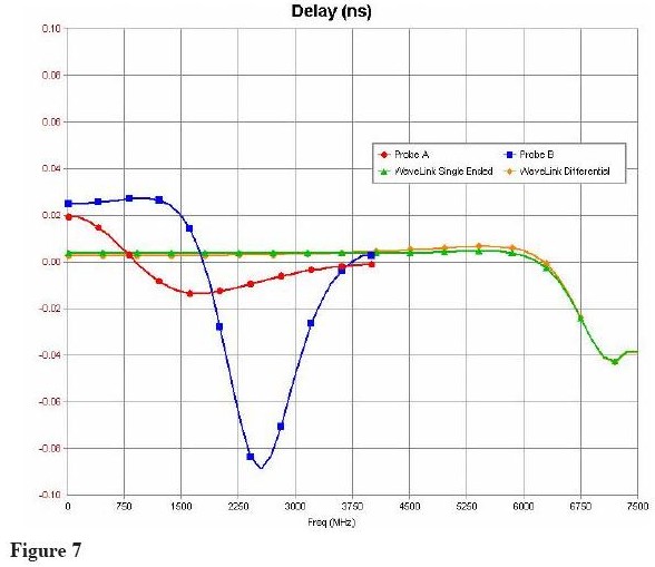 新的WaveLinks探頭不通過同一個測試信號,測量結果如Figure 10 所示。由于探頭負載(<1%)信號幅度有輕微的減少,但主要的信號邊沿完全沒有失真。探頭阻抗產生的延遲是2ps,不會隨著信號頻率改變。