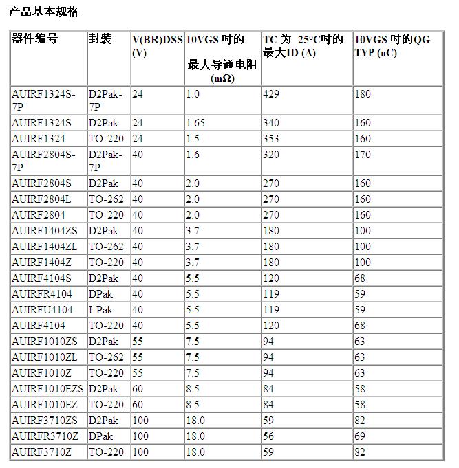 IR 亞洲區(qū)銷售副總裁潘大偉表示:“IR 這些經(jīng)過優(yōu)化的汽車專用MOSFET具有低導(dǎo)通電阻,具有寬泛的電壓和封裝。由于其表面形成了鈍化層,因而可以提高可靠性。此外,該器件的材料經(jīng)過調(diào)整、優(yōu)化后可達(dá)到堅固、耐用的效果。”