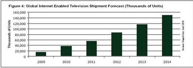 同樣,隨著品牌廠商努力延緩價(jià)格下跌速度和吸引消費(fèi)者來更換其原有的老式平板電視,未來幾年對(duì)于IETV的推廣活動(dòng)將會(huì)增強(qiáng)。iSuppli公司預(yù)測(cè),2014年IETV市場(chǎng)將從2009年的1470萬臺(tái)增長到1.49億臺(tái),復(fù)合年度增長率為58.9%。