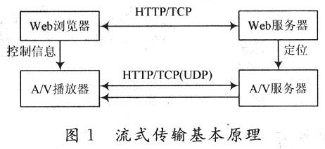需要說明的是,在流式傳輸中,使用RTP/UDP和RTSP/TCP兩種不同的通信協(xié)議與A/V服務(wù)器建立聯(lián)系,是為了能夠把服務(wù)器的輸出重定向到一個(gè)不同于運(yùn)行A/VHelper程序所在客戶機(jī)的目的地址。實(shí)現(xiàn)流式傳輸一般都需要專用服務(wù)器和播放器,其基本原理如圖1所示。